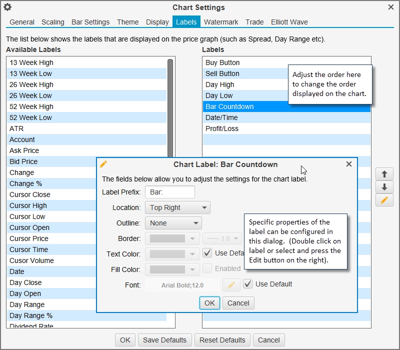 Double click on one of the labels in the right hand box (or select and press the edit button, ie pencil icon) to edit the properties of the label (see embedded dialog above). From there you can choose which corner to display the label and adjust the color, font etc. The order in which the labels are displayed is determined using the up/down arrow buttons in the Chart Settings dialog (see above).