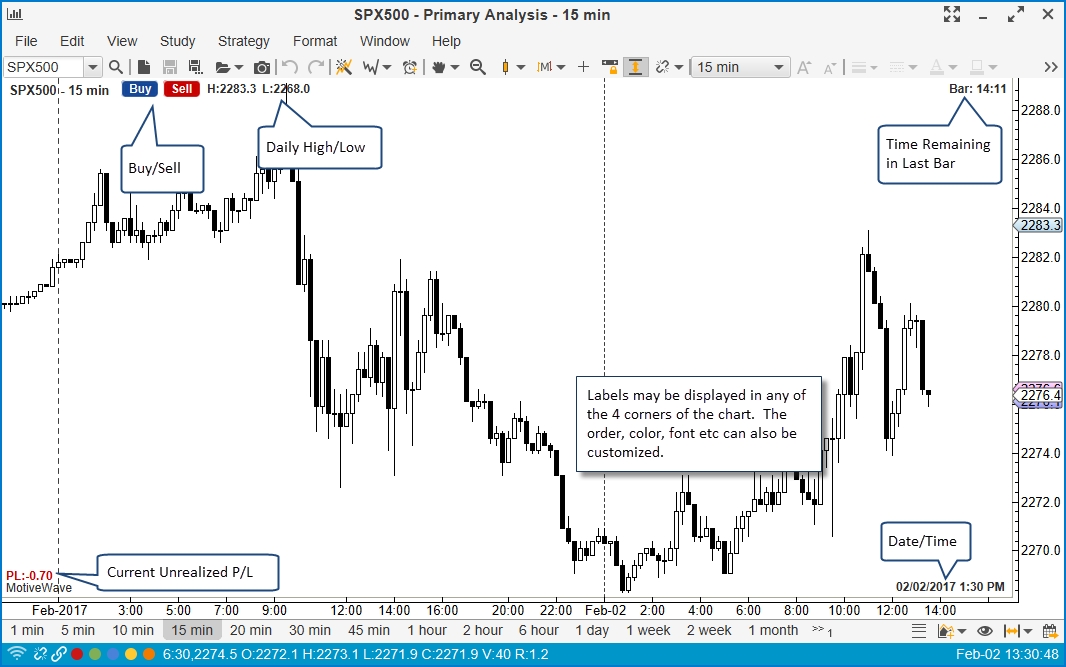 Chart labels display information on the Price Plot of the chart. These labels can appear in any of the 4 corners. The following example shows some chart labels: