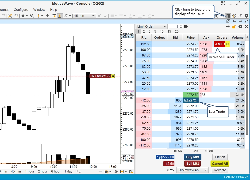 The Depth Of Market (DOM) panel shows a tabular view of the current bid and ask sizes. Choose View -> Display -> DOM Panel from the top menu bar to show or hide this panel on a chart. For convenience a toggle button is also available on the tool bar. For details on how to use the DOM panel see Depth Of Market section.