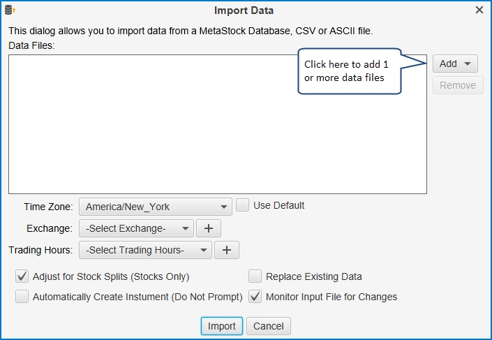 MetaStock™ Database – MetaStock™ Database files containing 1 or more instruments may be imported into MotiveWave’s historical database.