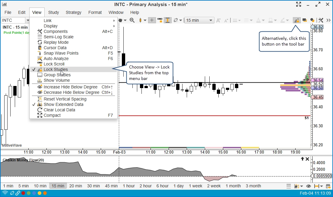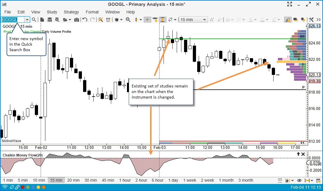 The Lock Studies feature is a convenient way to keep the current set of studies on a chart when you change the instrument. Choose View -> Lock Studies from the top menu bar to enable this feature on the selected chart. To change the instrument on a chart, type the new symbol into the Quick Search box on the left side of the tool bar and press the Enter key.