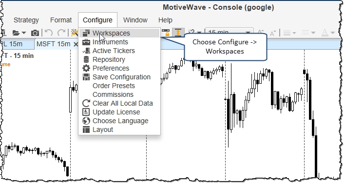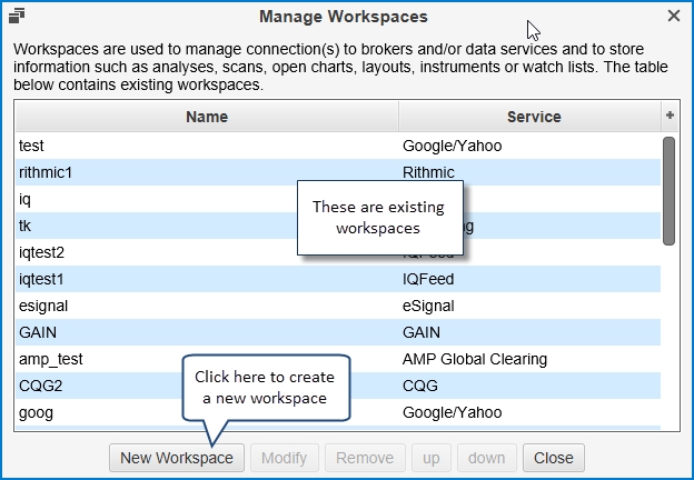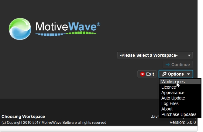 Connections to Brokers and Data Services are managed through workspaces. Each workspace is a separate instance of MotiveWave™ and contains its own local database. All data, settings and analyses are separate between each workspace (with the exception of themes and historical data).