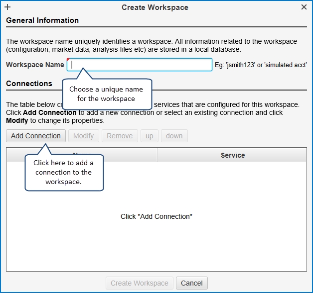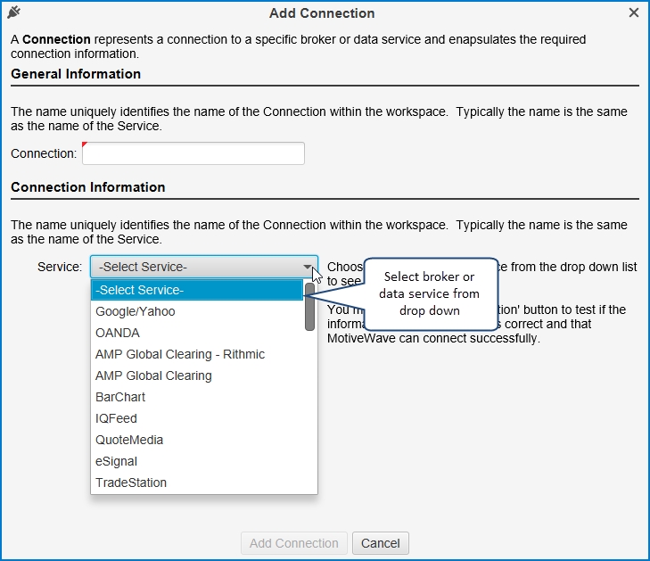 From the connection dialog (see below) you can choose the broker or data service that you want to add to the workspace. Connection information will depend on the broker/data service that you choose.