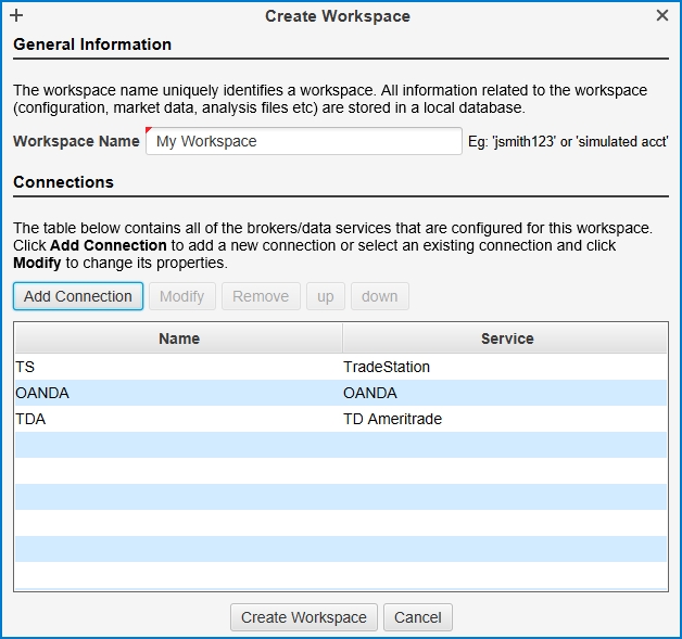 The following dialog shows an example of a workspace with three connections (TradeStation, OANDA and TD Ameritrade).
