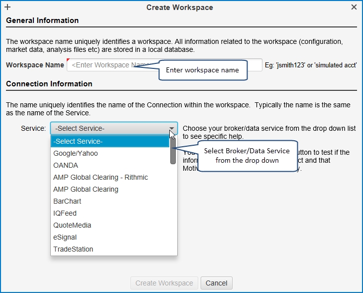 For the other editions of MotiveWave (Community, Standard, Order Flow) only a single connection to a broker or data service is allowed within a workspace. The following diagram illustrates the create workspace dialog for these editions. Simply choose a name for the workspace and choose the connection type from the service drop down.