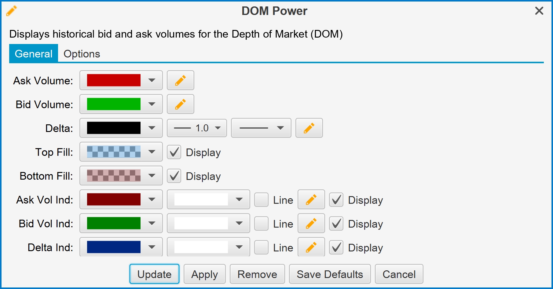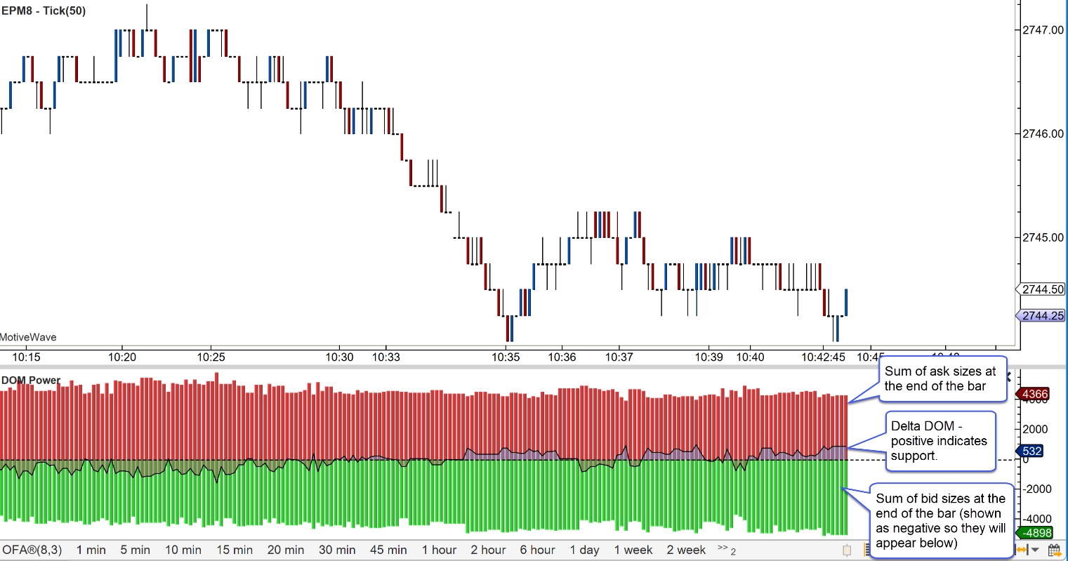 Displays historical bid/ask sizes for the Depth of Market (DOM). Note: Historical DOM values are built in memory. Recording begins when the study is opened or a DOM panel is opened. The delta is displayed to show where support and resistance exists. The delta is the difference between the total bid size and the total ask size. For convenience, the bid sizes are shown as negative values so they will appear below the ask bars.