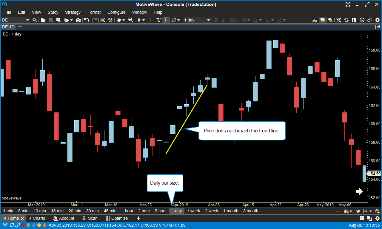 In the example below we have a trend line drawn on daily bars from the low of March 28 to the low of April 5. Since we are using daily bars we can’t attach an exact time to the start of the trend line, so we assign it to the open of the day. Remember the only times we can assign are either the open or the close.