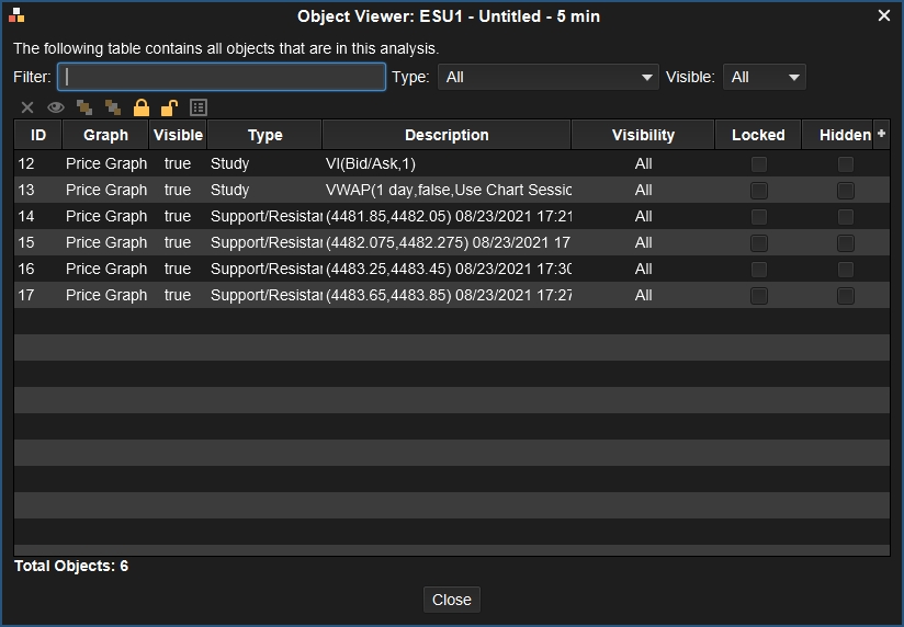 If you would like to view and or modify the studies and components on your chart it may be difficult to pick them out if you have a busy or complex chart. In order to bring up a list you can go to View > Object Viewer or else press CTRL + V on your keyboard.