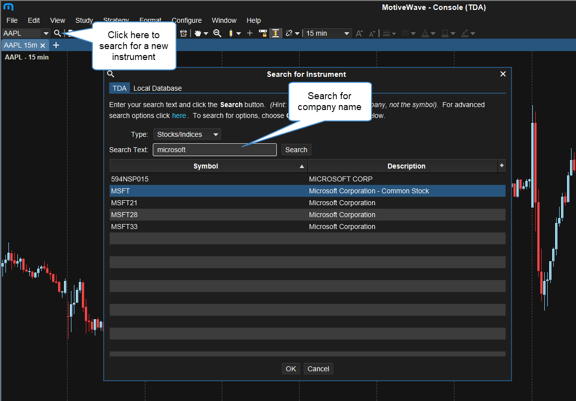 TD Ameritrade's instrument search will not return your desired results when you search for the instrument symbol (e.g MSFT), instead you must use the first word in the company's name/description (e.g. Microsoft). If you're unsure of the company name/description you can use TDA's symbol lookup: https://research.tdameritrade.com/grid/public/symbolLookup/symbolLookup.asp?frompage=