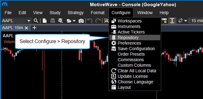 This can be very useful if you want to synchronize the MotiveWave data between multiple computers over a network or cloud based service such as Google Drive or Drop Box. Choose Configure > Repository from the Console menu bar to access the Repository settings.