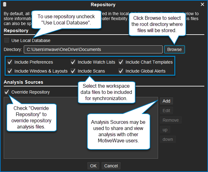 The Repository feature in MotiveWave allows you to save your workspace data files in the file system instead of the local database.