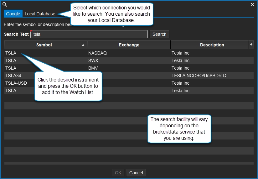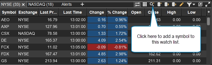 When you create a workspace, several default watch lists will be created for you. The available watch lists will depend on the broker and/or data service that you selected. If you would like to add a symbol to an existing watch list, simply click on the Search/Add Instrument button in the Watch List tool bar.
