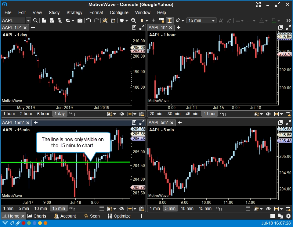 With the visibility setting now set to 15 minutes only, the line component only shows on the 15 minute chart.