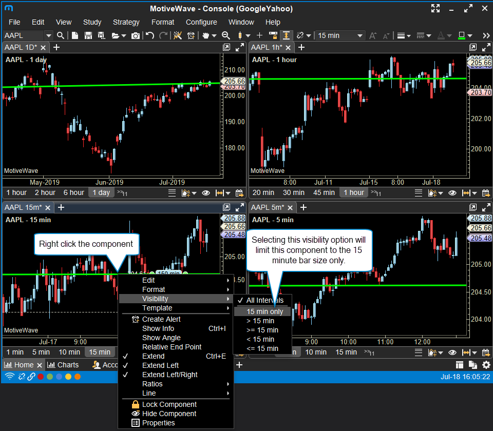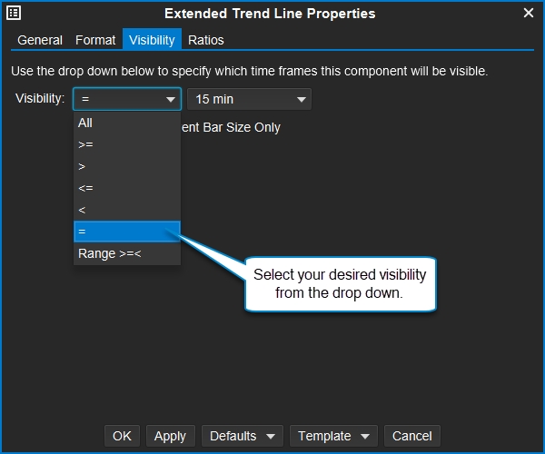 Visibility is a very useful feature in MotiveWave® that enables you to specify the bar sizes where a component is visible. This can be very useful to avoid clutter when switching bar sizes on a chart.