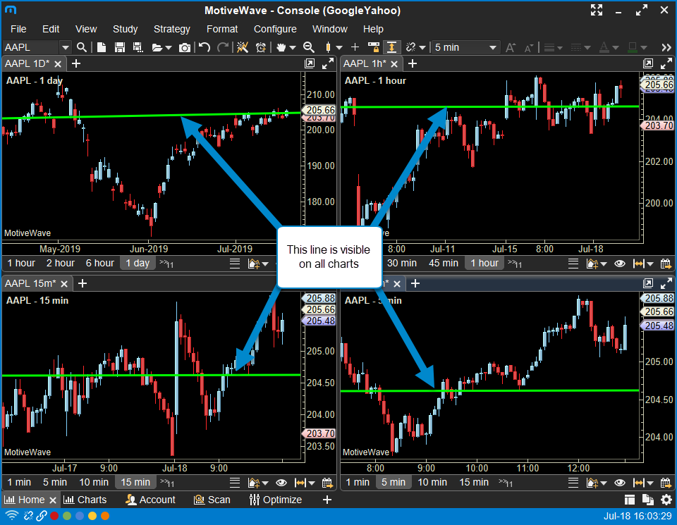 In the screenshot below, the initial visibility setting for the line component is set to All Intervals allowing it to show on all open charts of that particular symbol.
