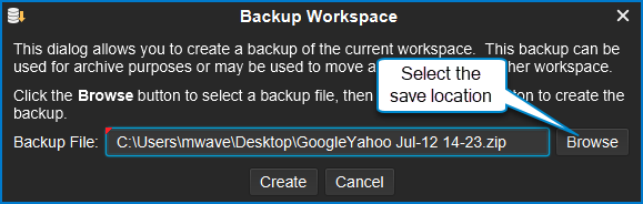 When you click the Create button, a backup file will be created on your computer desktop. This backup file will be named <Workspace Name> <Date>.zip (where <Workspace Name> is the name of your workspace and <Date> is the current date/time). If you would like to change the name and location, click on the Browse button.