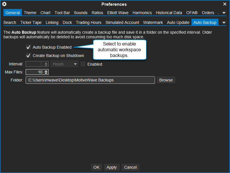 MotiveWave® also has an Auto Backup feature that will automatically create workspace backups at a selected interval. Having workspace backups from the previous week or more can be very beneficial should something happen to your workspace or analysis. To enable this feature go to Configure > Preferences > General > Auto Backup.
