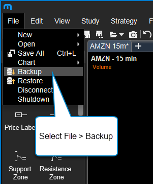 Keeping a backup of your workspace(s) is good practice as it gives you a quick and effective way to restore your MotiveWave® workspaces to a previous working state. Backups should be stored on a separate computer or online in the event of a system crash or hardware failure. The Backup feature enables you to export settings, analyses, instruments, watch lists, scans and open windows/positions to a single backup file.