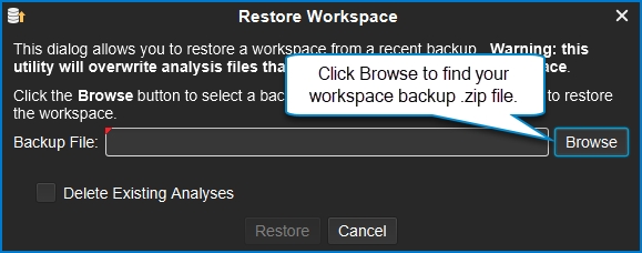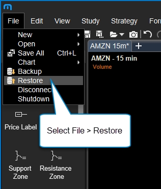 The Restore feature allows you to restore your workspace settings, analyses, instruments, watch lists, scans and open windows/positions as originally saved in the backup file . Select File > Restore from the Console menu bar to select a backup file.