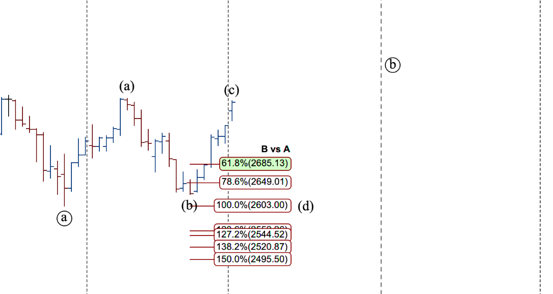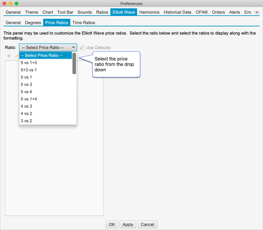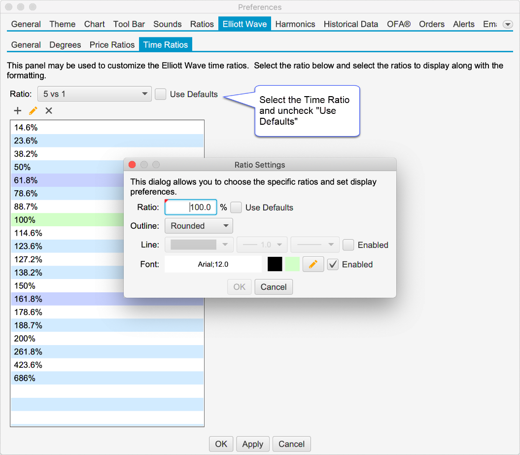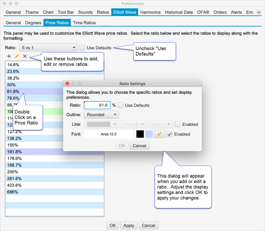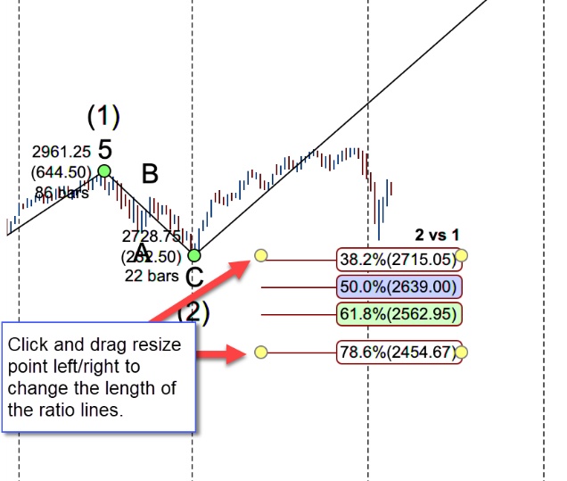 Fibonacci ratios between waves are an essential tool for forecasting price movements. MotiveWave supports all price and time ratios (examples: 2 vs 1, 4 vs 3, B vs A, C vs A+B, X vs W). Multiple ratios can be displayed at the same time and conveniently accessed using keyboard shortcuts.