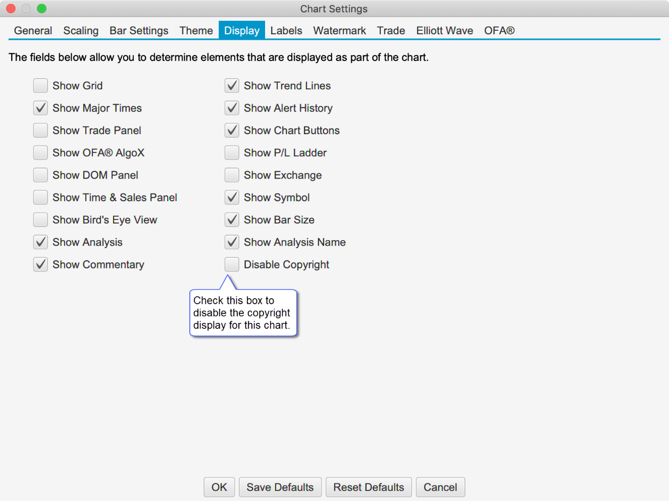 The copyright display can also be selectively disabled for a chart from the Chart Settings dialog (right click on chart an choose Chart Settings, see Display tab). Check the Disable Copyright box and press the OK button.