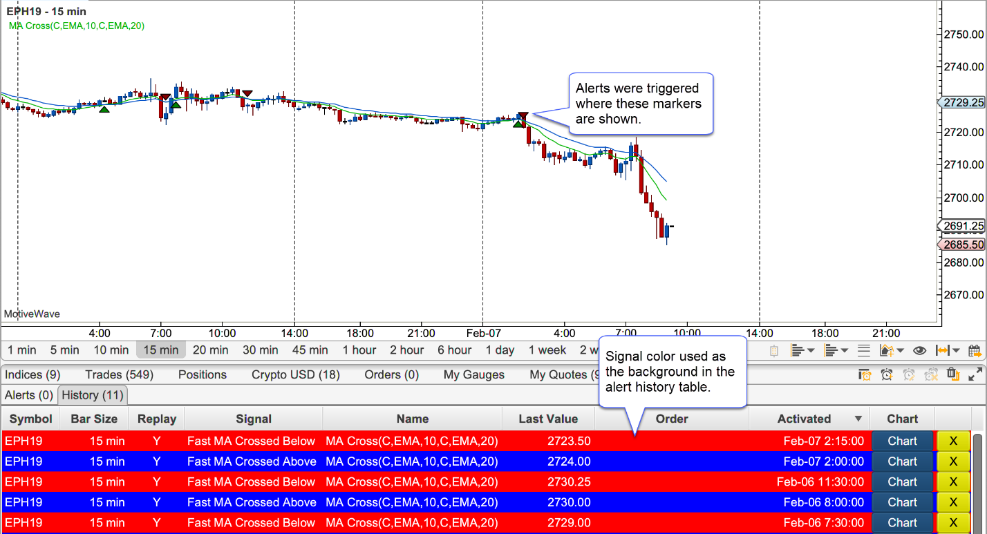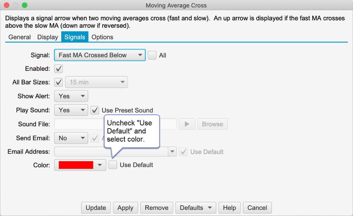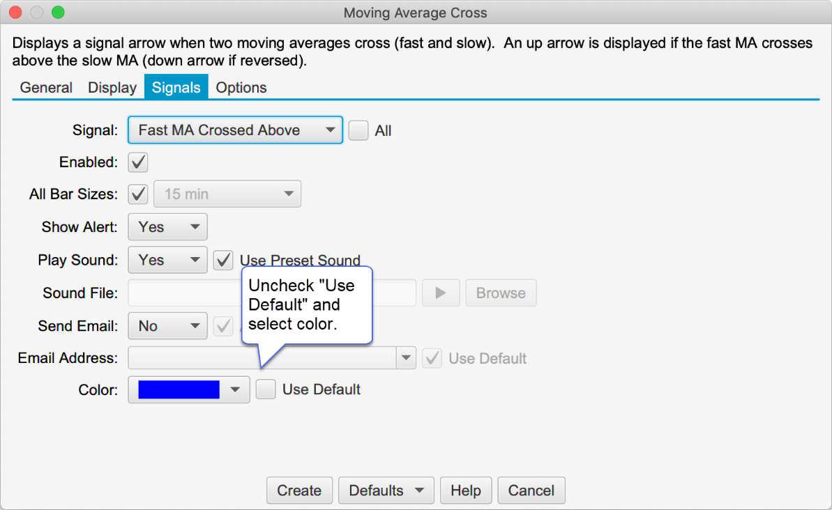 Colors for signals generated by studies can be set from the Signals tab of the Study Dialog. The example below shows a blue color assigned when the Fast MA crosses above the Slow MA and a red color assigned when the Fast MA crosses below the Slow MA (using the Moving Average Cross study).