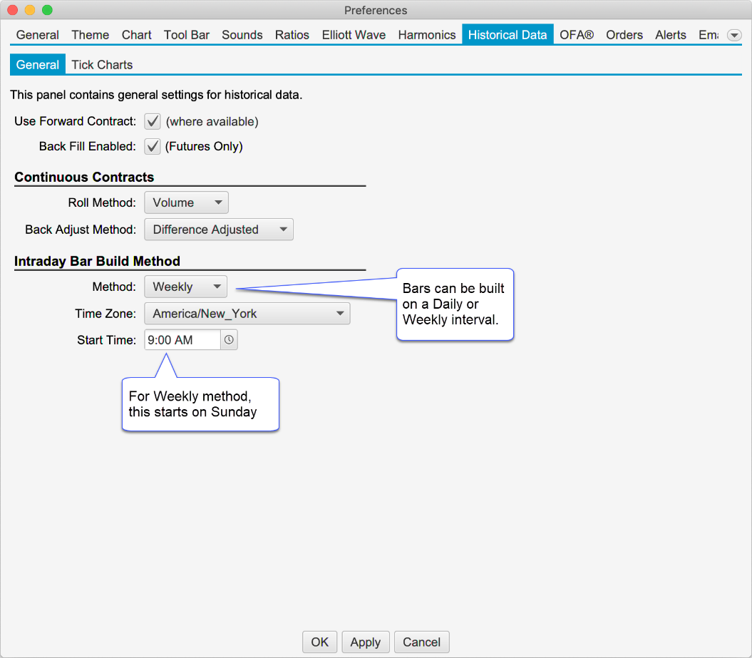 All other bar sizes are built by combining data from the raw bars. By default, these bars are built on a weekly interval starting at 9:00 am on Sunday (EST).