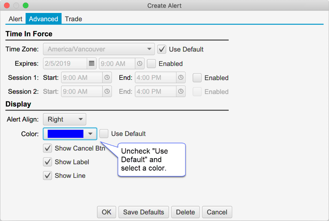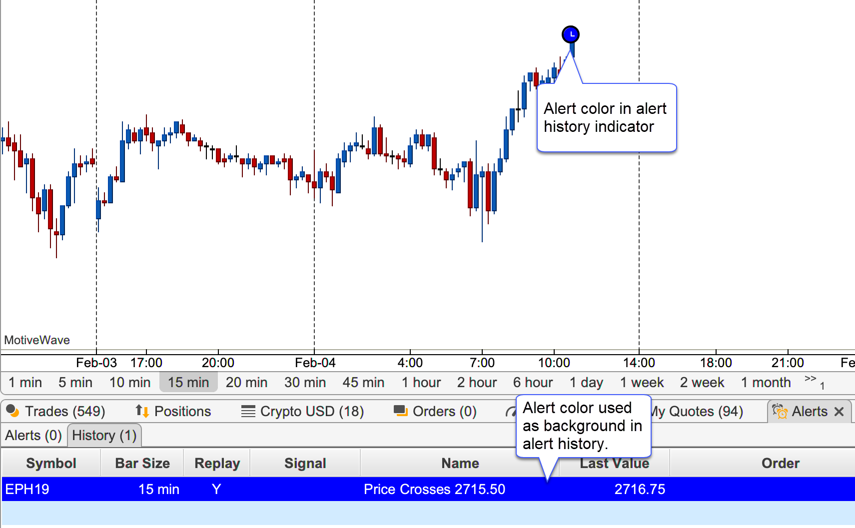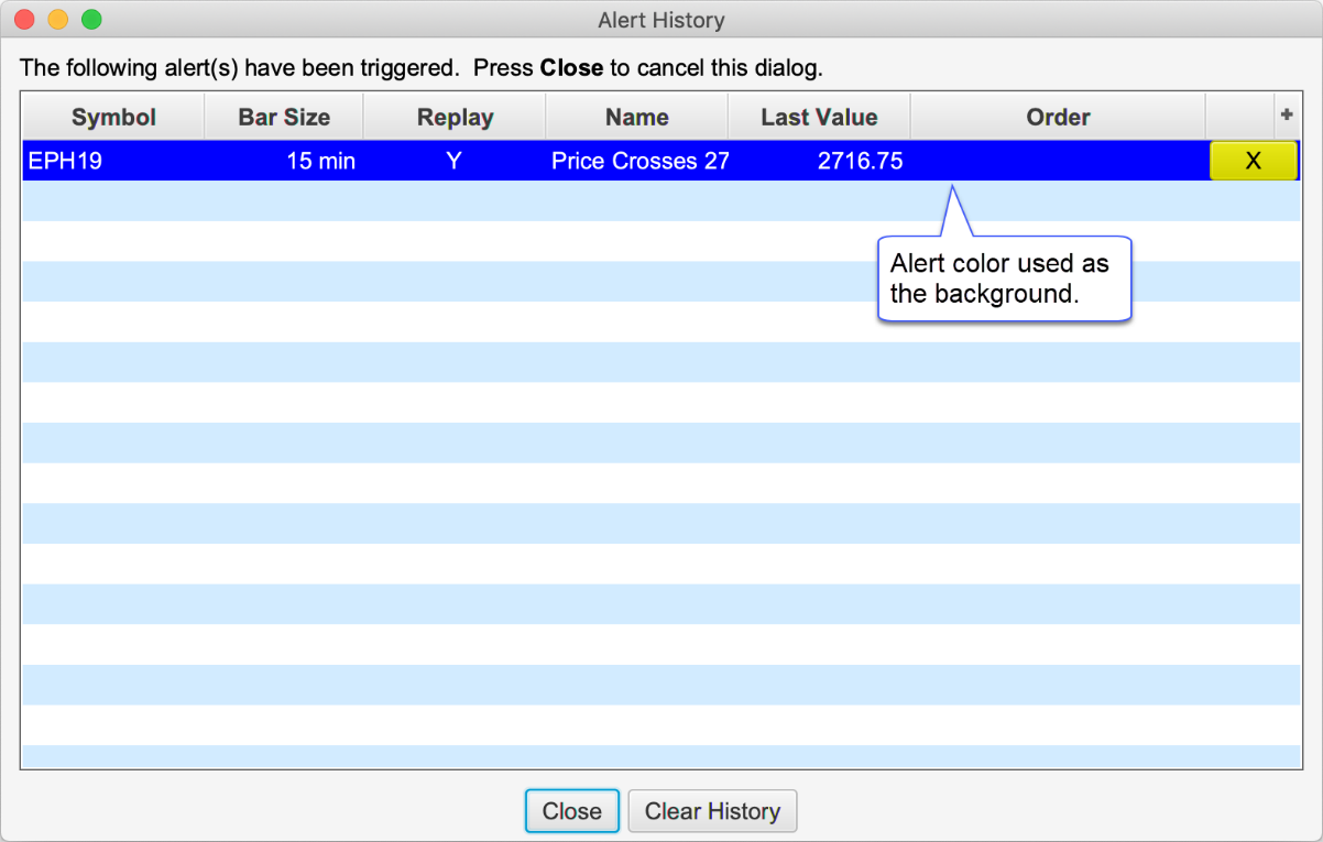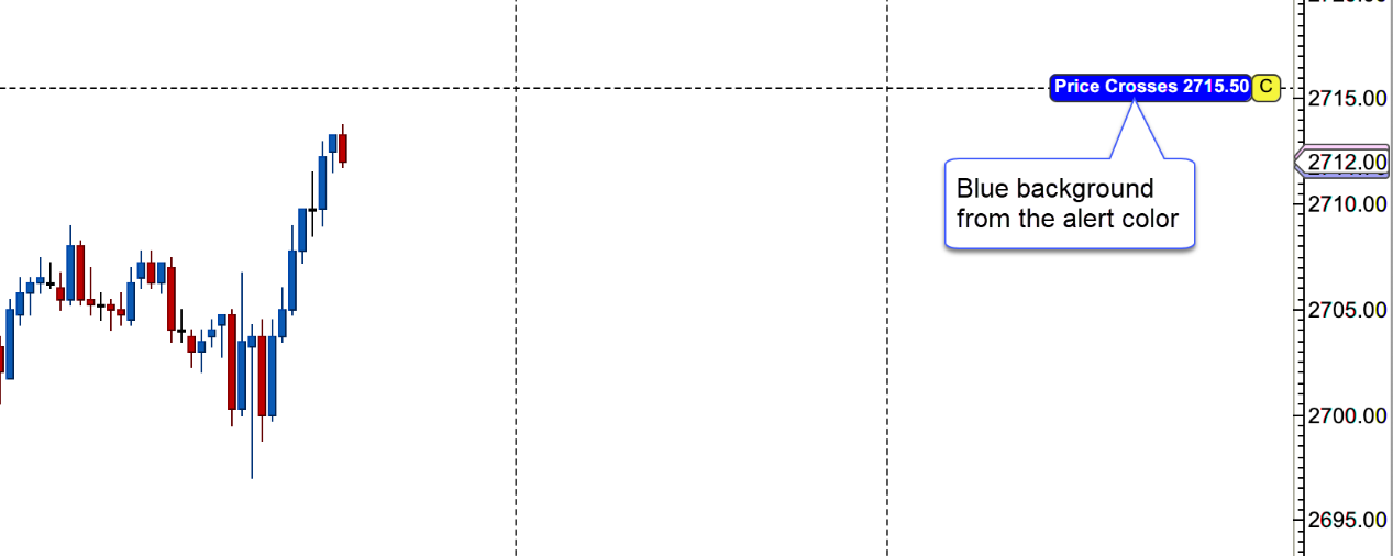 This color is displayed as a background color for the alert on the price chart, Alerts panel and the Alert History window: