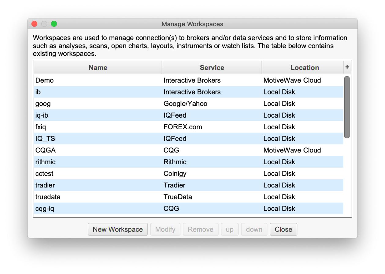 Cloud workspaces are hosted on MotiveWave’s server and can be accessed from any computer using the same license key. Cloud workspaces hold all of their data in the MotiveWave™ cloud (including settings, instruments analysis etc.) but also hold a local copy so that the workspace can be opened in “offline” mode. Any changes that are made to the workspace in “offline” mode will be synchronized with the cloud workspace the next time you open the workspace in “online” mode.