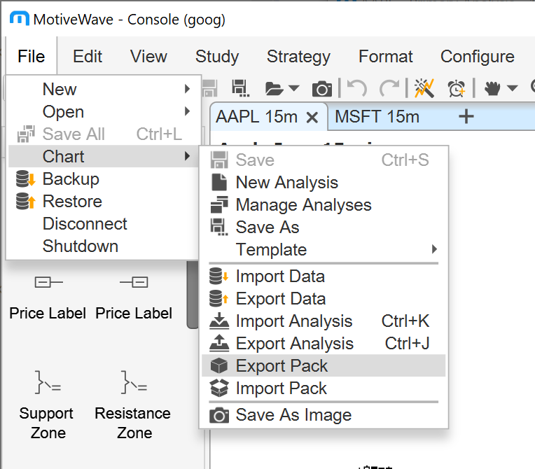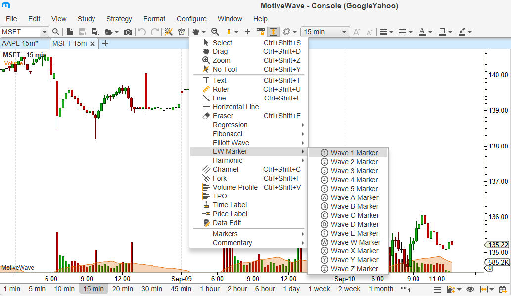 EW Tools - Simply choose the pattern you want to draw from a dropdown menu, then click on the chart where you want each of the points. As you click the points, MotiveWave will draw in the labels and lines for you. You can readjust where the pattern is at any time.