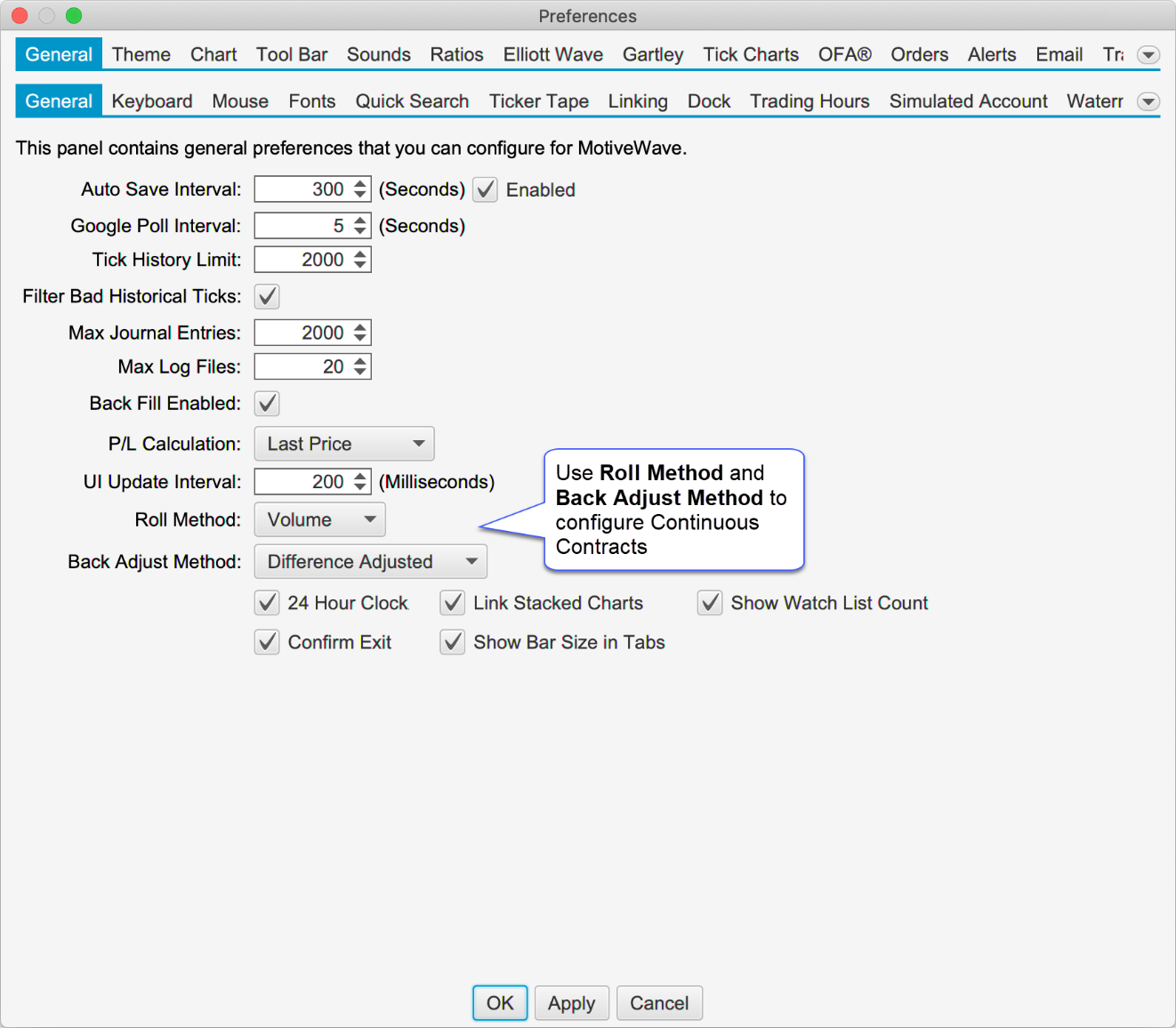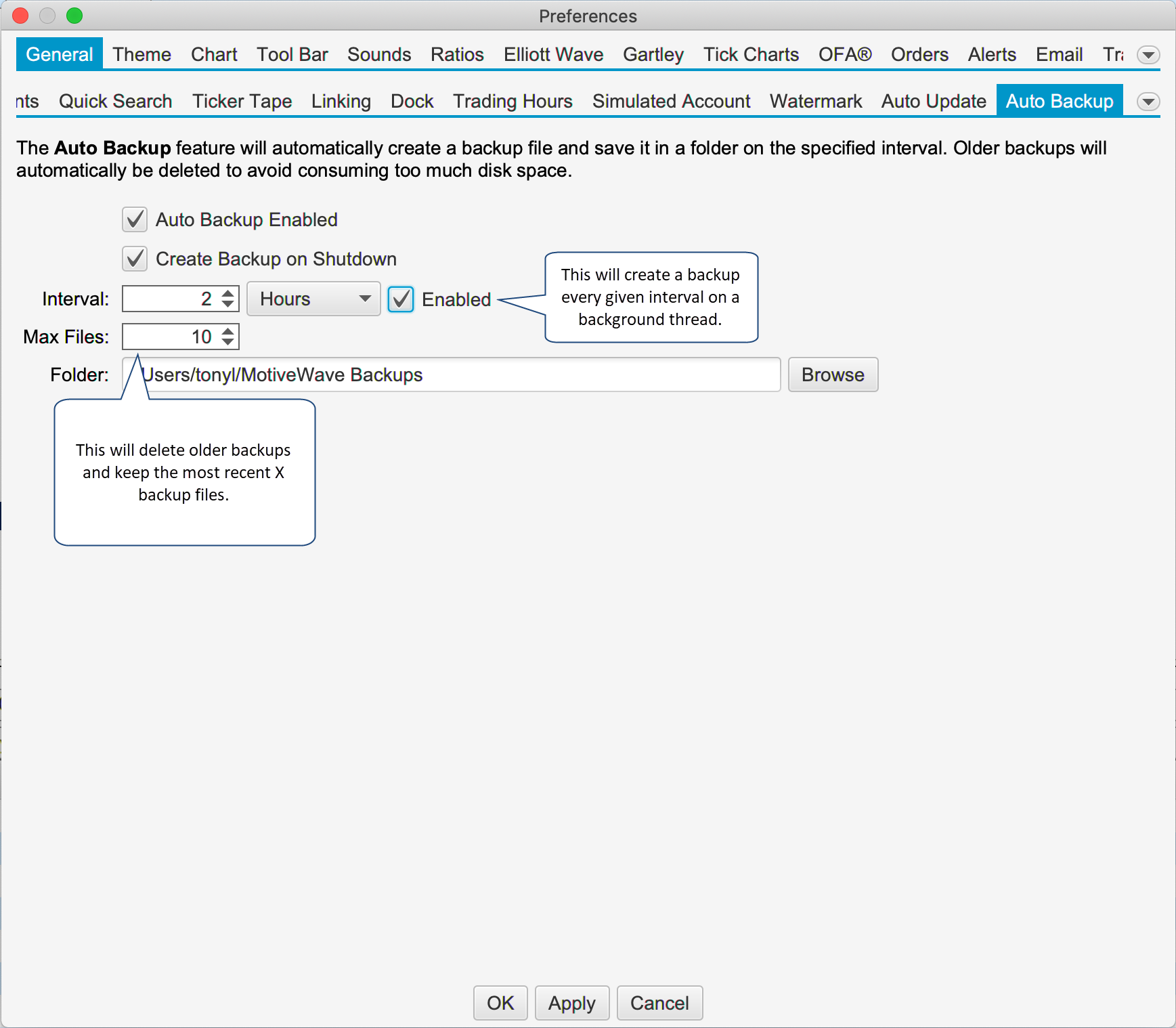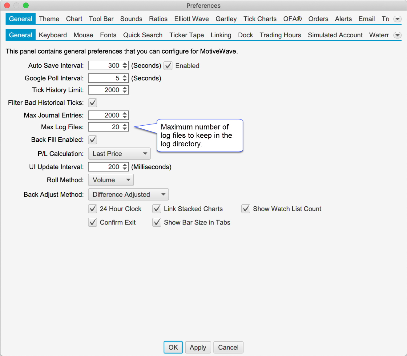 Every time MotiveWave™ is started a log file is created in the Log Folder (choose Help -> Log Files from the Console menu bar, or Options -> Log Files from the startup screen). Over time the number of log files in this folder can become quite large. As part of version 6, the number of files in this folder is trimmed to 20 (newest files are kept). You can change the number of log files that are kept (minimum of 5) in the Preferences Dialog (Configure -> Preferences from the Console menu bar, see General -> General tab).