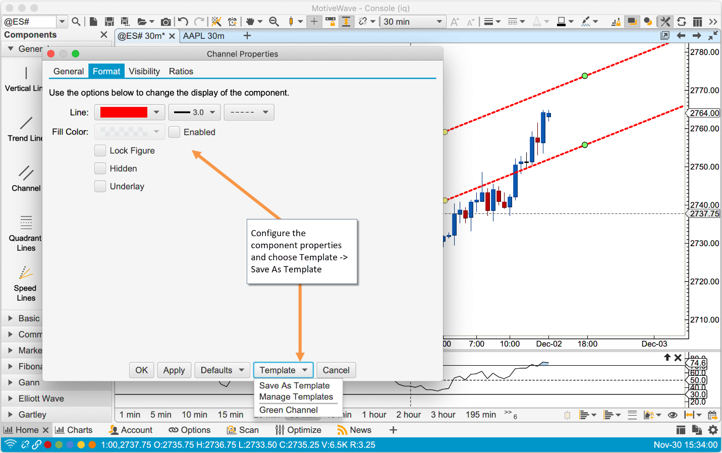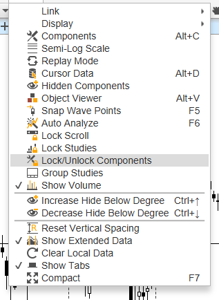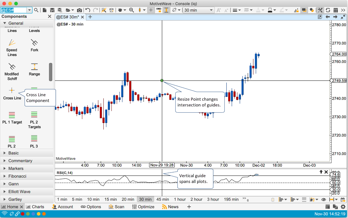 General Analysis Components like Trend Line (and extended), Horizontal Line (and extended), Vertical Line (and extended), Price Labels, Time Labels, Fork, Modified Schiff Fork, Channel (and extended), Range, Time and Price Range, Arrows, Support and Resistance Areas, Support and Resistance Zones, P&L Calculator/PL Targets, Cycle, Time Cycle, Wedges, Angles, Curves, Regression Tools, Circles (Radius, Diameter), Triangle, Quad Polygon, Sine Wave, Quadrant Lines, Tirone Levels, Speed Lines, Cross Line