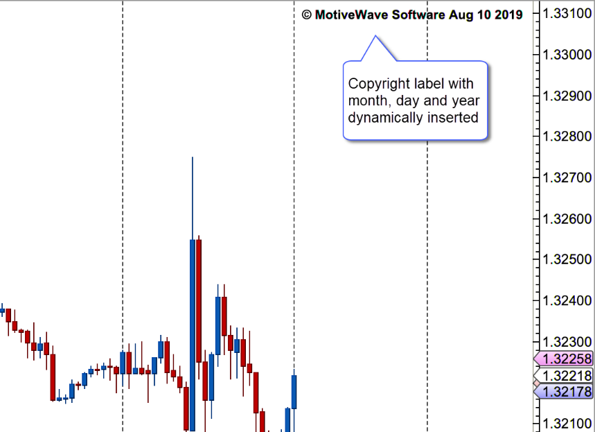 This feature is similar to the Watermark feature, but displays a copyright notice at a specific location on the chart. Day, month and year can optionally be inserted using the variables [DD], [MMM] and [YYYY]. This feature is in the General Preferences dialog (Configure -> Preferences from the Console menu bar, click on Chart, then on Copyright).