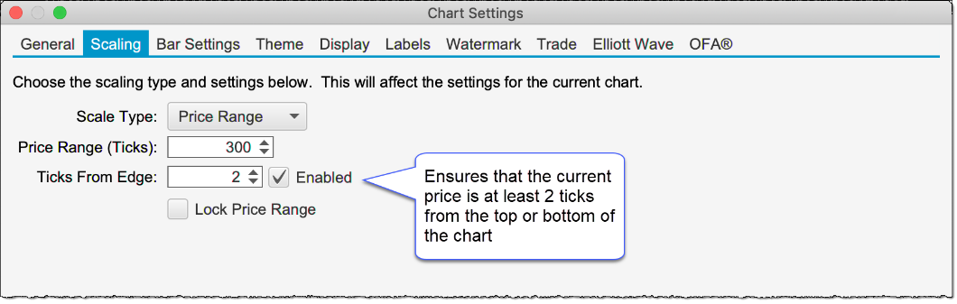 Ticks From Edge – Keeps the current price at least X ticks away from the top or bottom of the chart. This setting only applies when the current price is shown on the chart.