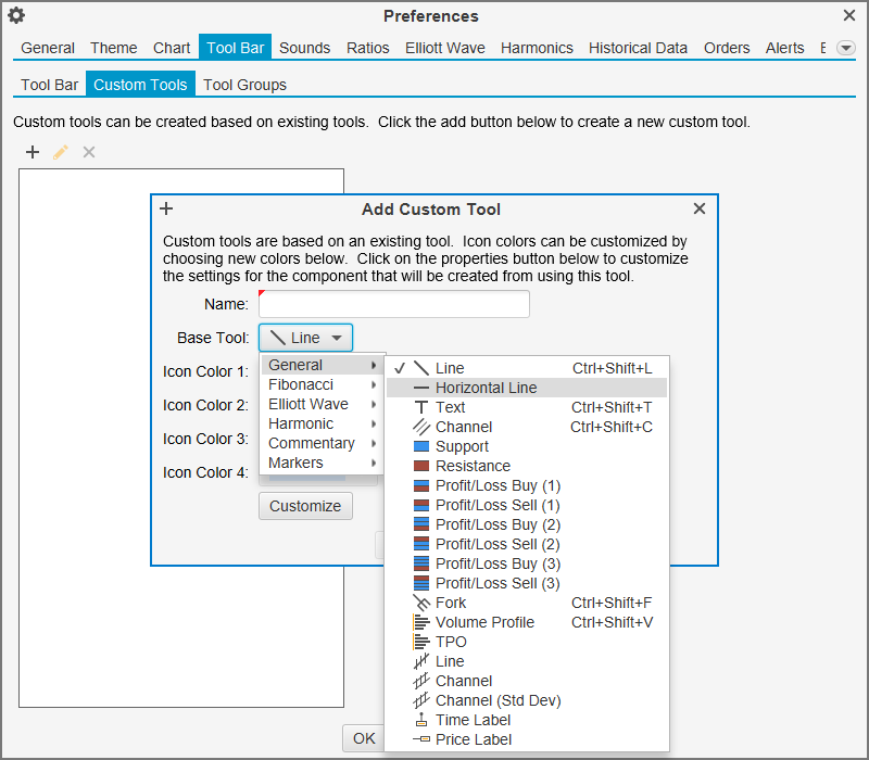 Trend Line (and extended), Horizontal Line (and extended), Vertical Line (and extended), Price Labels, Time Labels, Fork, Modified Schiff Fork, Channel (and extended), Range, Time and Price Range, Arrows, Support and Resistance Areas, Support and Resistance Zones, P&L Calculator/PL Targets, Cycle, Time Cycle, Wedges, Angles, Curves, Regression Tools, Circles (Radius, Diameter), Triangle, Quad Polygon, Sine Wave, Quadrant Lines, Tirone Levels, Speed Lines, Cross Line