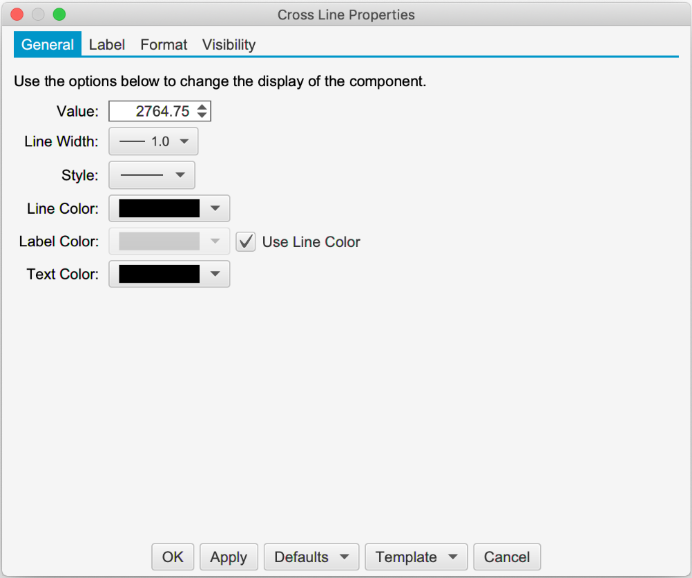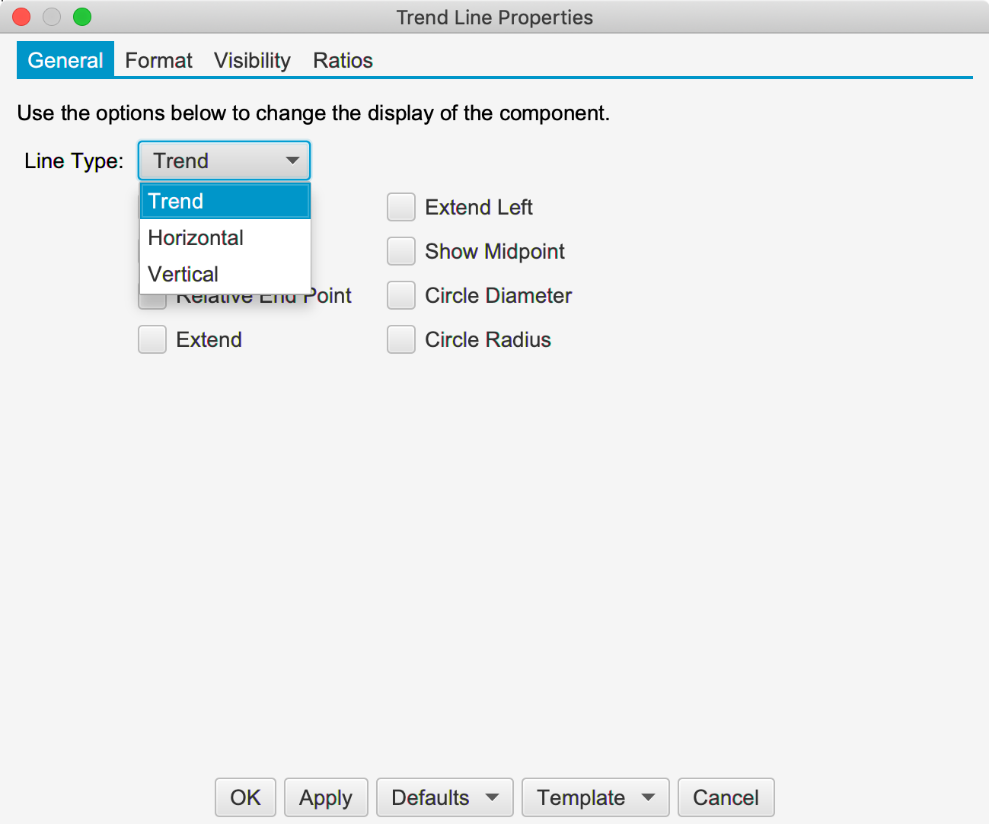 A Line Type option has been added to the Trend Line component (see Properties dialog). This option will allow you to set a trend line to be Horizontal or Vertical. The main purpose of this feature is to enable the creation of a custom horizontal or vertical line tool (see Custom Tools feature).