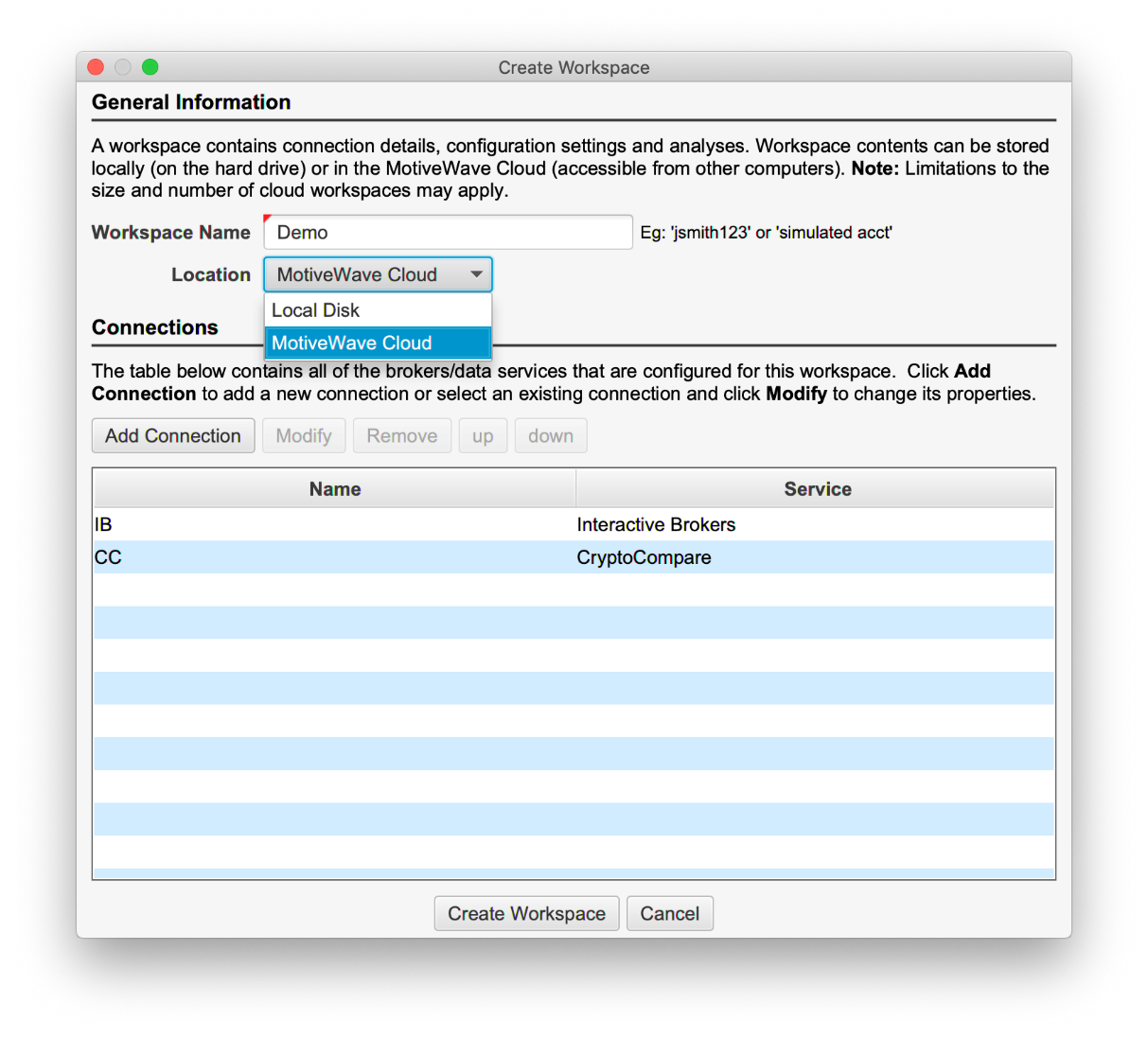 A cloud workspace can be created by choosing “MotiveWave Cloud” from the location drop down in the Create Workspace dialog (see screen shot below). Existing workspaces may also be moved to the cloud in the Edit Workspace dialog. Note: you cannot change the name of a cloud workspace.