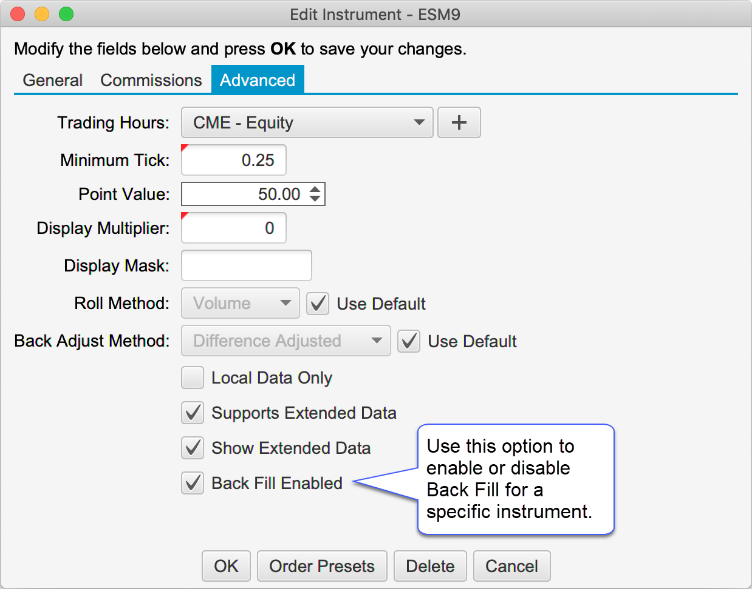 Back Fill may be enabled (or disabled) per instrument in addition to globally. This option can be found in the Instrument Dialog (right click on a chart and choose Edit Instrument, see Advanced tab):