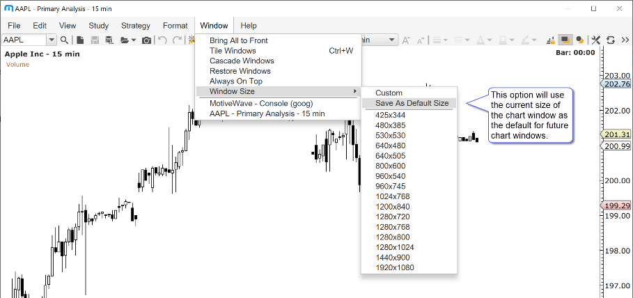 A default size can be applied to a chart window when they are created or popped out from the console.