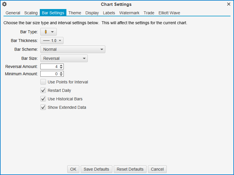 Reversal Amount – price movement in ticks from the high or low of the bar for the bar to complete. The bar is considered complete when the close has reversed from the high/low by an amount equal or greater than this amount. Reversal bars alternate between reversing from the high and low (ie if one bar reverses from the high, the next bar will reverse from the low)