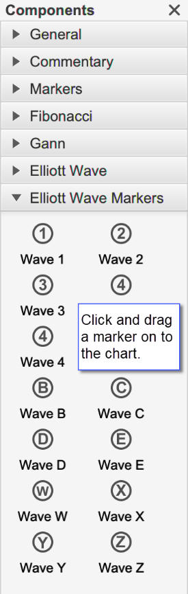 Elliott Wave Markers - A simpler version of the Elliott Wave components, which may be used to place an Elliott Wave label (just a label, no lines) on the chart. This can be useful for showing an alternative wave count on the same chart as the primary count.