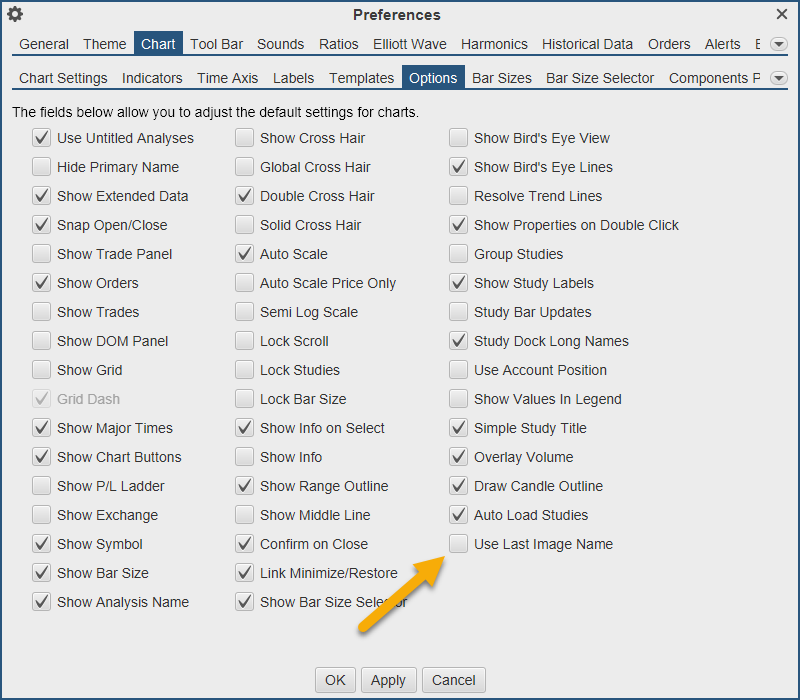 A new chart option “Use Last Image Name” (default off) has been added to the Chart Options panel (Configure -> Preferences -> Chart -> Options). If this option is enabled the last Save As Image file name will be used the next time you save the chart as an image (instead of generating the file name with the latest timestamp).