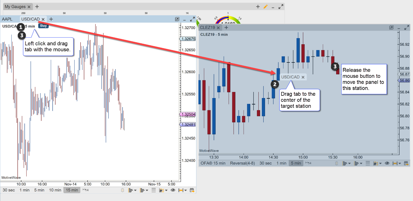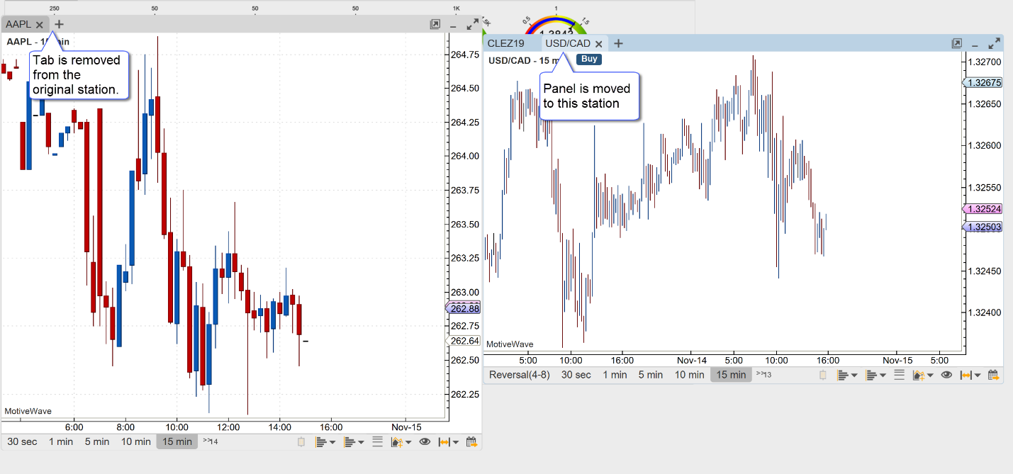 Panels can be moved from one station to another by dragging the tab (left click and drag with the mouse) into the content area of another station.