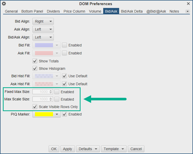 Max Scale Size – Sets an upper limit on the max bid/ask sizes. Use this to lessen the effects of unusually large bid/ask values.