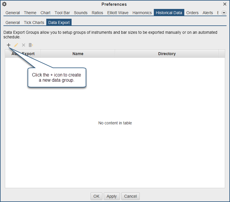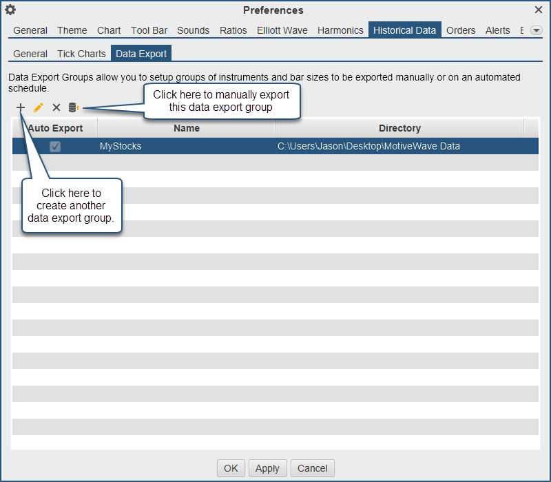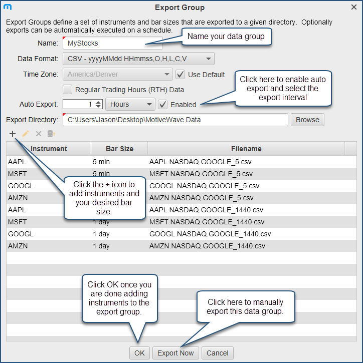 Auto Export – Enable this to automatically export this group at your selected time interval. Note, you will need to restart MotiveWave for the Auto Export function to begin.