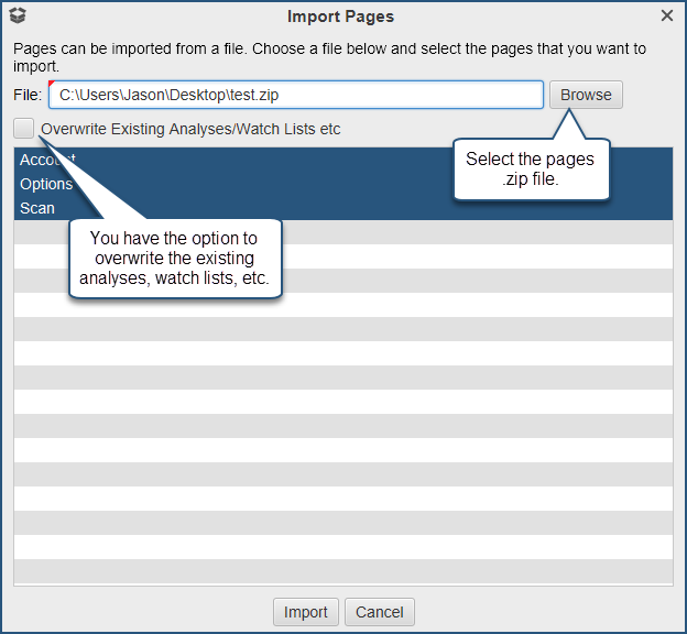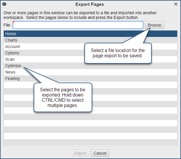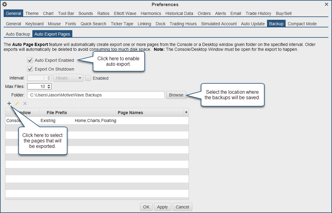This feature allows you to export specific pages from the Console or Desktops. These pages can be imported to another instance of MotiveWave using the Import Page option (See File -> Import/Export Pages from the top menu bar). Pages can also be setup to export on a schedule. See Preferences dialog (Configure -> Preferences -> General -> Backup -> Auto Export Pages).