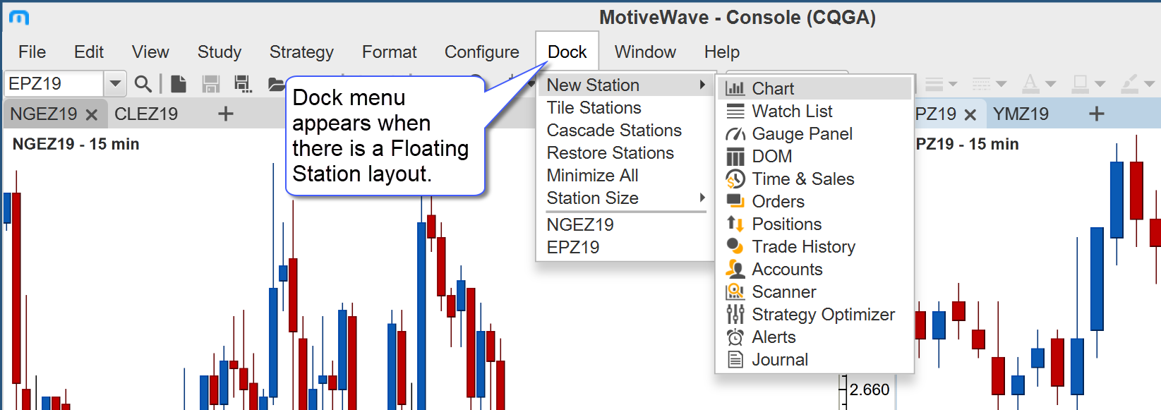 The Dock (top menu bar, only visible from a Floating Station layout) and Context Menus (right click) have several options for managing stations in the floating layout: