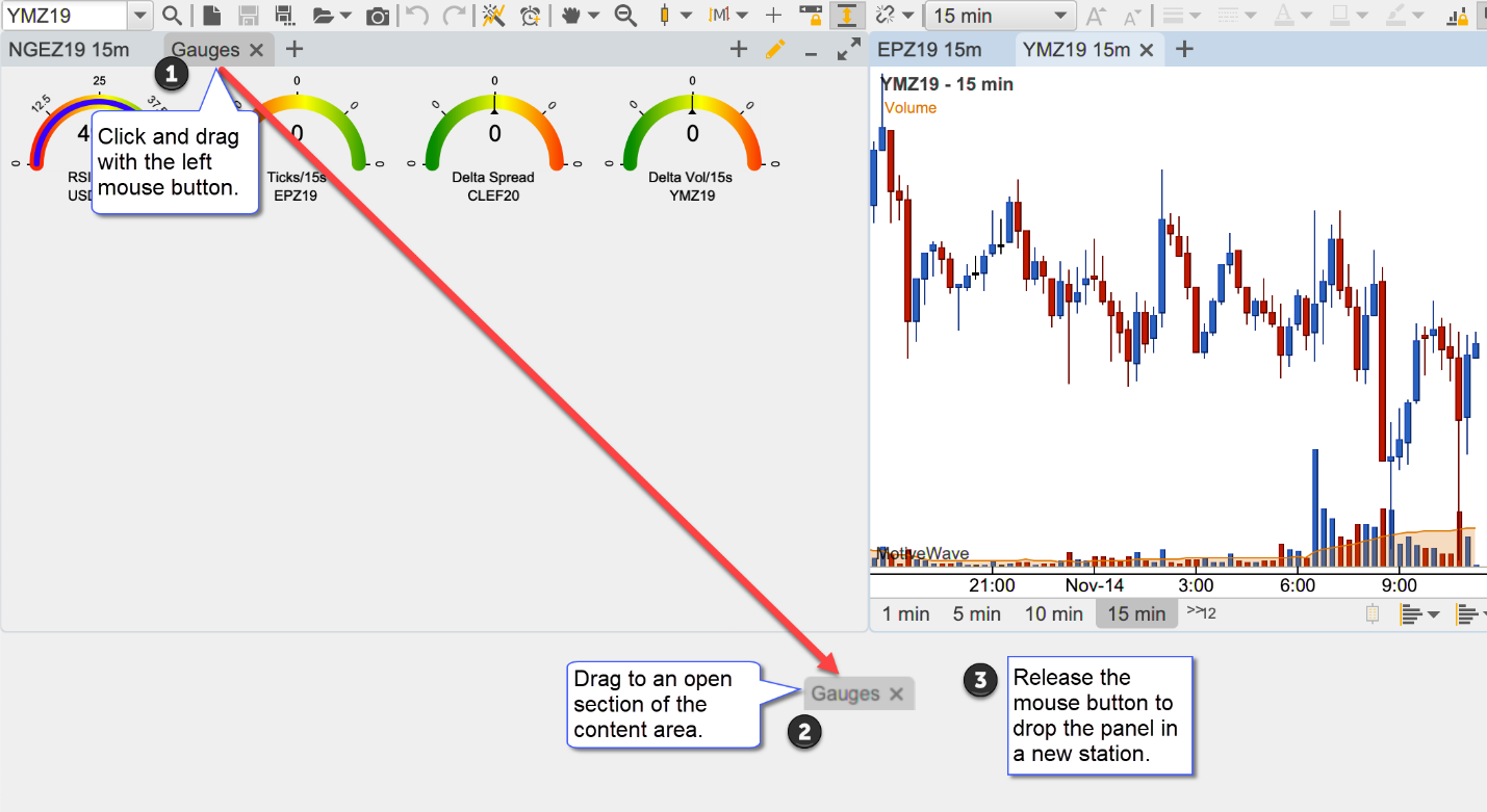Dragging Station Tabs – Station tabs can be dragged into an open section of the content area.