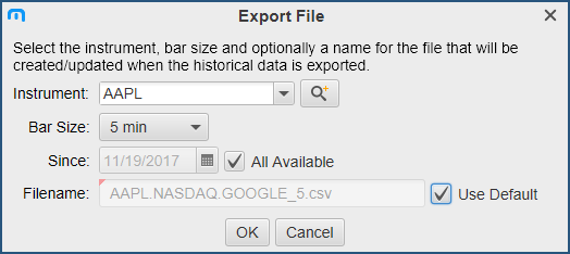 Click the + icon to add an instrument, from this dialog you can search for an instrument, select the bar size, the amount of data and the filename of the CSV file. You are also able to export multiple bar sizes for each instrument.