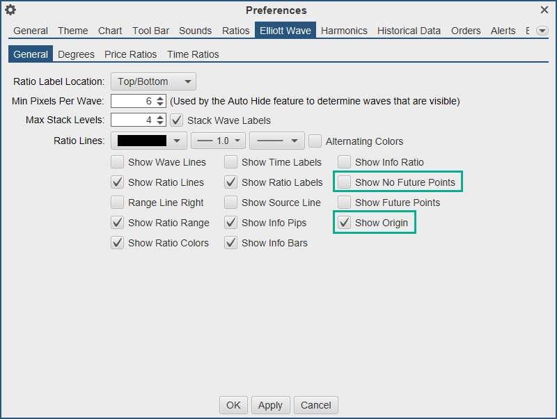 The following options have been added the Elliott Waves. See Preferences dialog “Elliott Wave” tab and the Component Properties dialog (double click on the wave):
